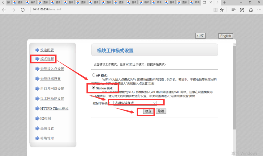 4、在“模式选择”里,勾选“STA模式”,“数据传输模式”选择“透明传输模式”,点击“确定”,如图