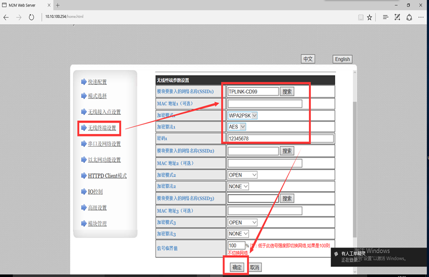5、在“无线终端设置”里“搜索”选择要连接的路由器名称,选择正确的“加密模式”和“加密算法”,填写正确的“密码”,点击“确定”,如图