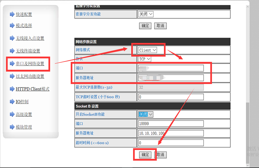 6、在“串口及网络设置”里,选择“网络模式”为“Client”,协议为“TCP”,“服务器地址”填写正确的服务器公网IP,“端口”填写服务器上位机端口号,点击“确定”,并选择“重启”,如图