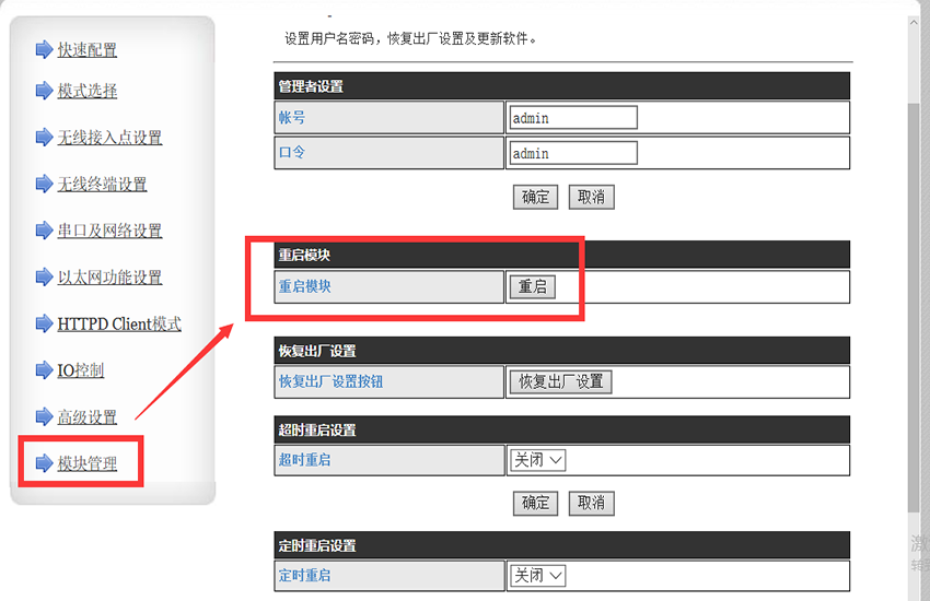 3、在浏览器里输入10.10.100.254,打开模块的参数设置界面,默认用户名和密码均是admin,如图