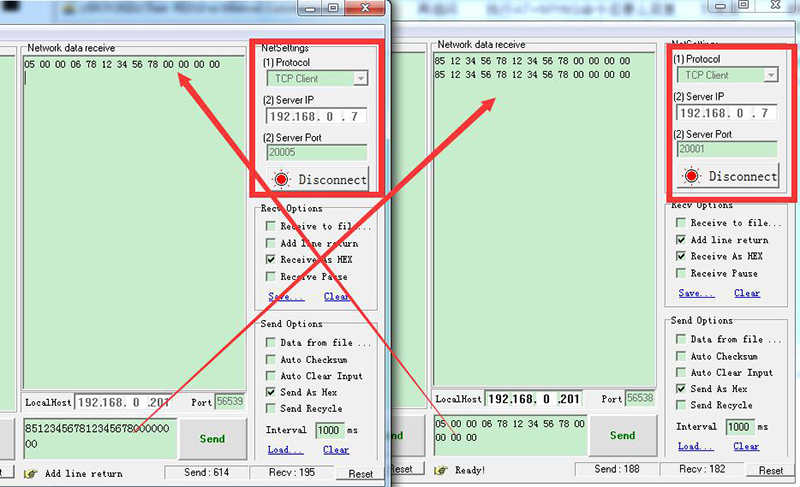 Can1为192.168.0.7-20001;can2位192.168.0.7-20005两个网络助手之间的通信如下(数据格式为13字节,按16进制发送)