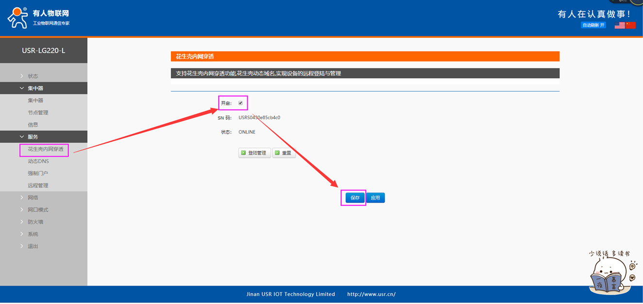 1. 进入集中器配置网页,选择“服务”、“花生壳内网穿透”,勾选“开启”,保存后重启集中器