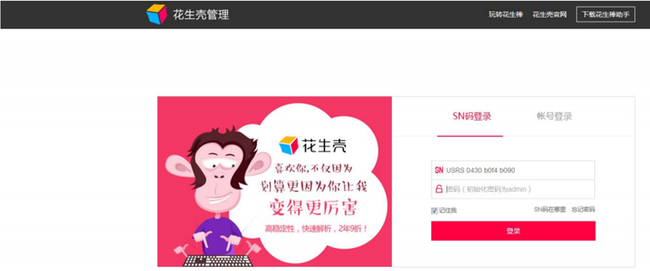 2. 重启集中器后再次进入花生壳内网穿透界面,点击“登录管理”,进入登录界面,选择SN码登录,首次登录默认密码为:admin