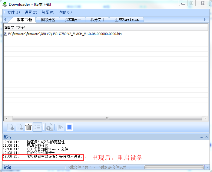 6. 出现“未检测到有效设备!等待插入设备”时,断电重启模块;等待固件下载完成即可