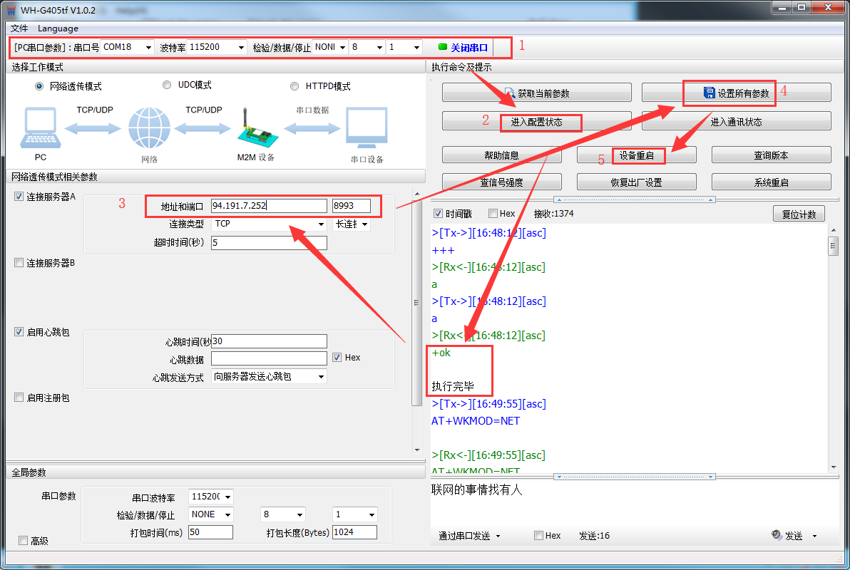 打开串口--->进入配置状态--->成功的话,会返回执行完毕--->修改服务器地址和端口--->设置并保存参数--->模块重启