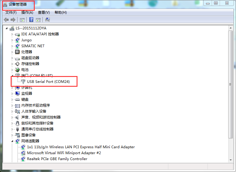 其中串口号可以在电脑的“设备管理器”中查看,见下图;