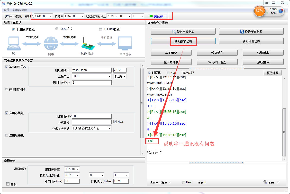 (4)打开串口后,先点击进入配置状态,如果模块能返回+ok的字符,说明电脑和模块连接是没有问题的;然后点击进入通讯状态,做数据通讯测试。如果不返回+OK的话,请参考(步骤3)