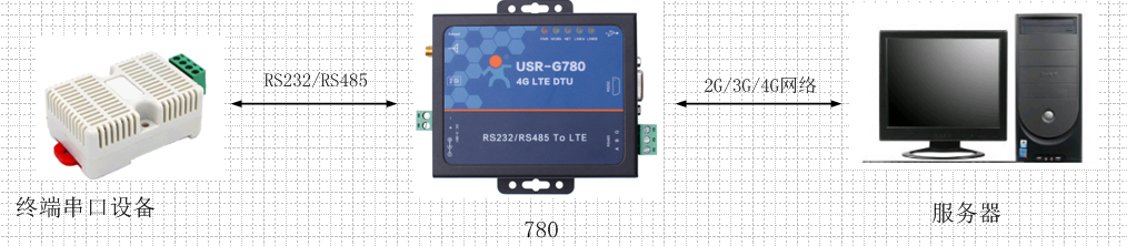 网络拓扑结构: 终端串口设备发送数据--->780 V2--->服务器