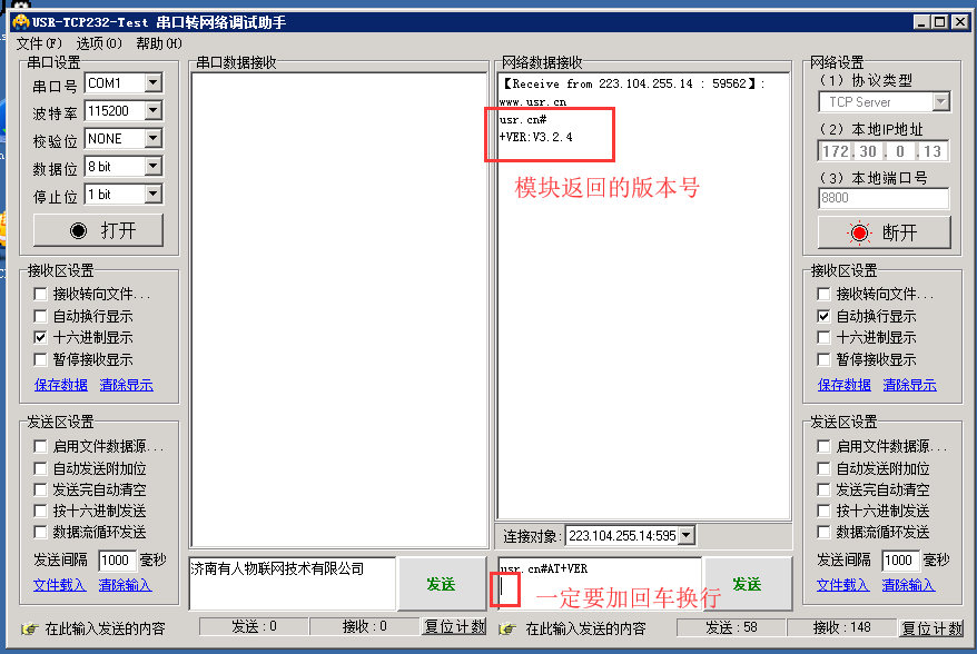 注意:AT指令的最后一定要加回车换行,