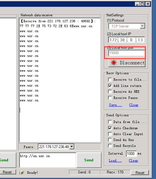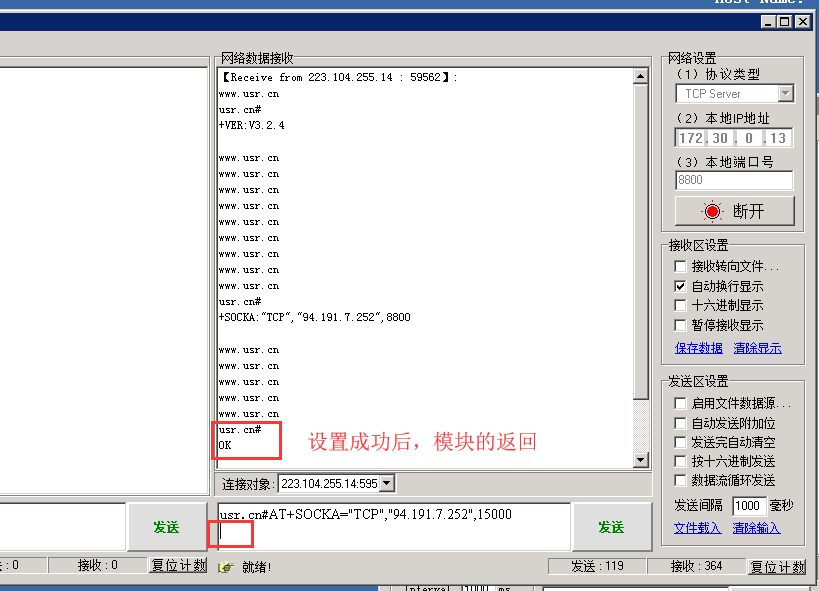 设置SOCKA的参数:usr.cn#AT+SOCKA=”TCP”,”94.191.7.252”,15000