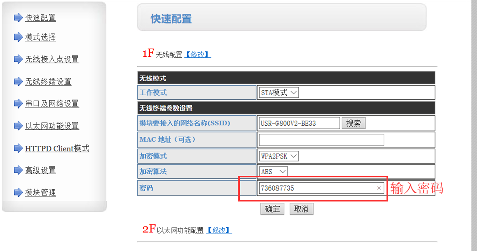 (1)点击快速配置,选择STA工作模式,点击搜索,搜索路由器,选择要连接的路由器