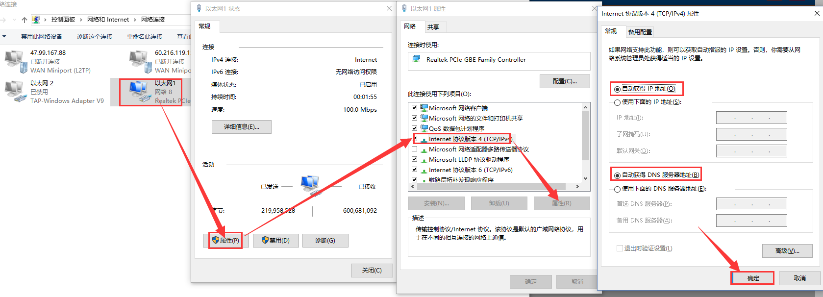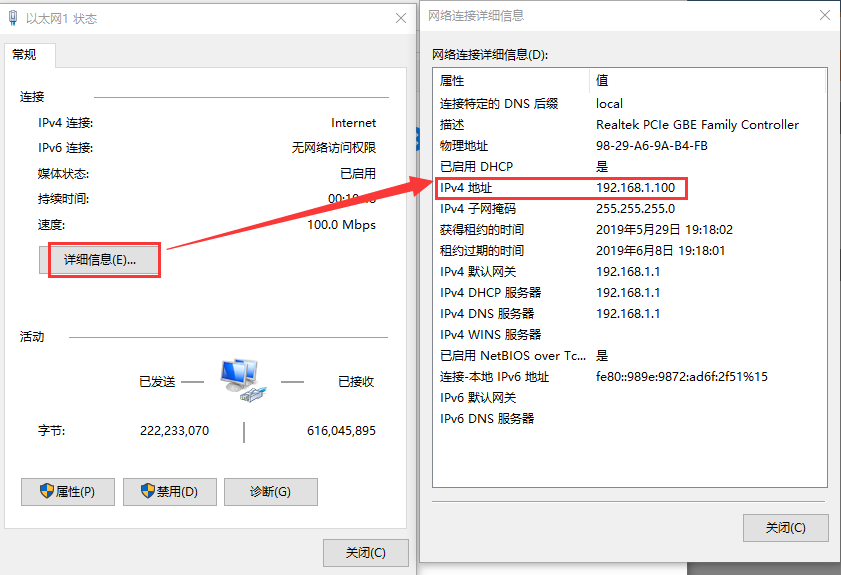 打开网络共享中心,双击对应的网络适配器,点击属性,选择IPV4,点击属性,修改电脑为自动获取IP,然后点击确定。(如果电脑本来就是自动获取IP,这一步可以跳过)点击详细信息可以查看到电脑获取的IP地址: