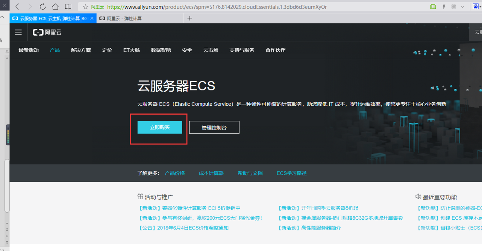 云服务器ECS:云服务器(Elastic Compute Service, ECS)是一种简单高效、安全可靠、处理能力可弹性伸缩的计算服务。其管理方式比物理服务器更简单高效。用户无需提前购买硬件,即可迅速创建或释放任意多台云服务器。