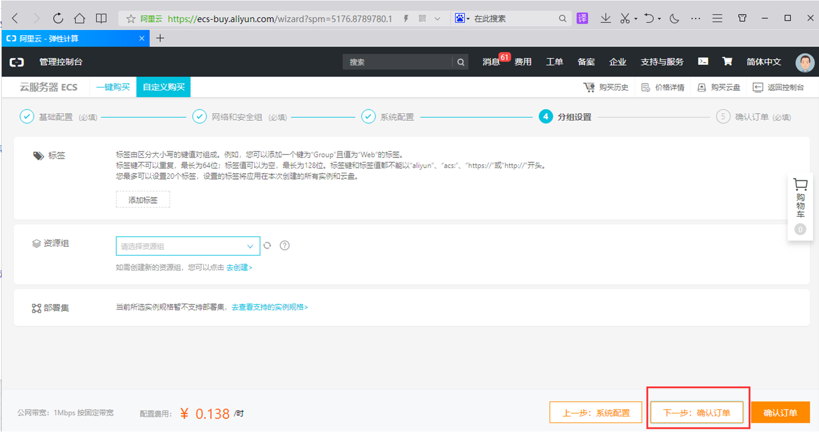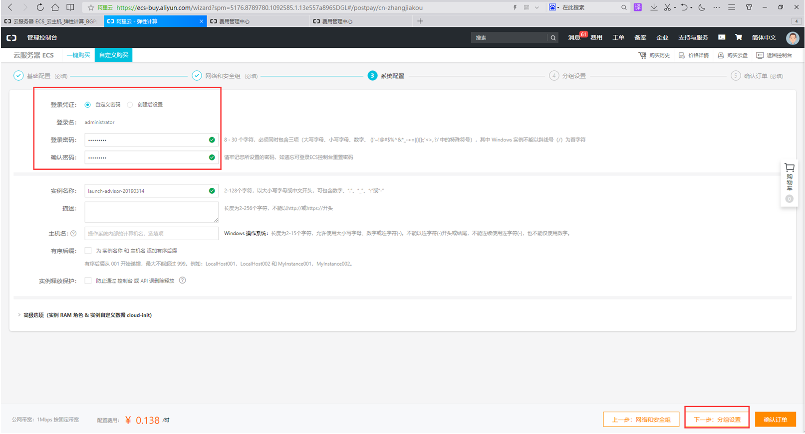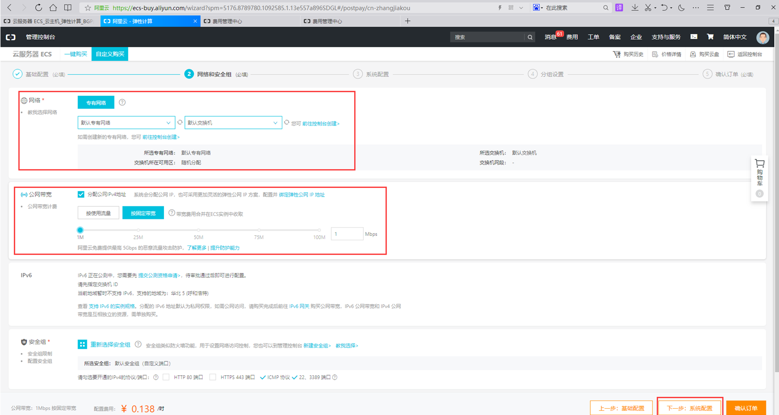 5、配置网络和安全组,根据需求配置,点击下一步系统配置。本案例配置: