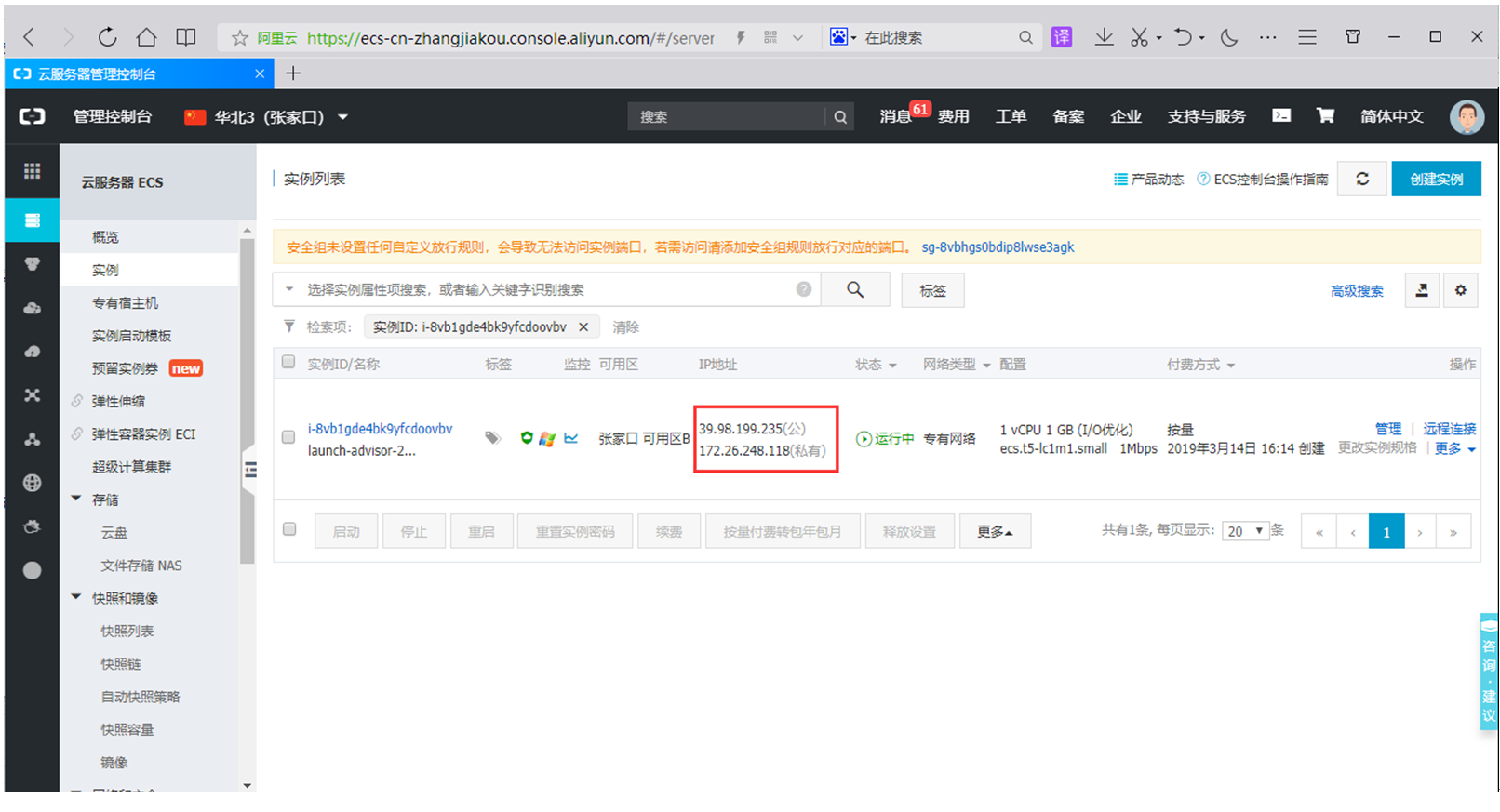 10、至此服务器创建成功,可以看到服务器公网IP为393893199.235,私有IP(内网)为172.26.248.118。