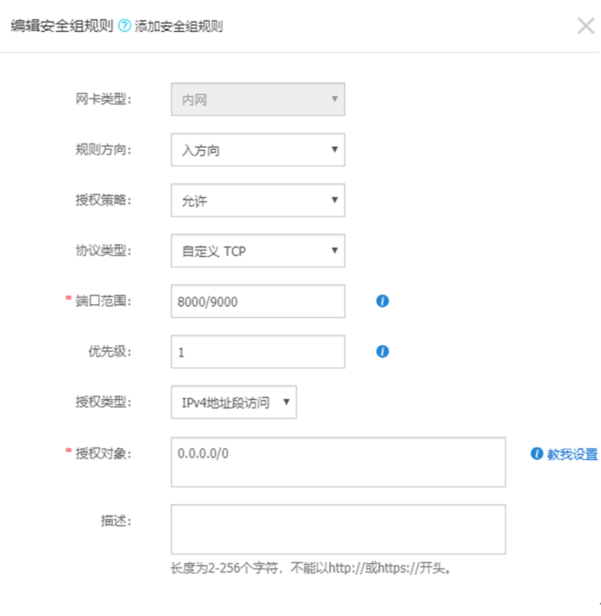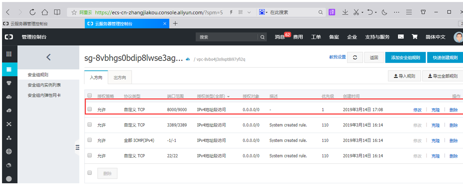 11、在控制台里添加安全组规则,设置好支持哪些端口访问,8000/9000表示8000~9000端口可以 访问。