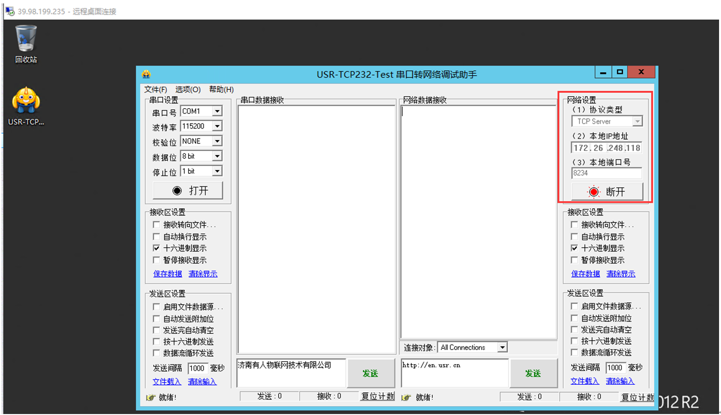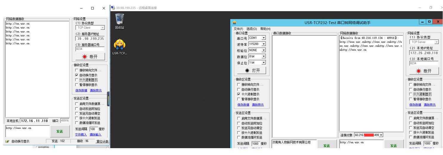 7. 电脑或有人设备,确保可以上网的前提下,设置模式为TCP Client 目标IP:39.98.199.235目标端口:8234,即可和服务器通信,本案例以电脑的调试助手为例。