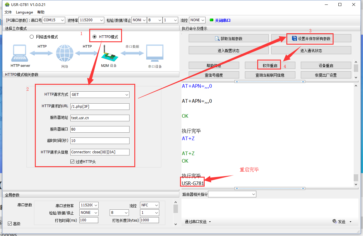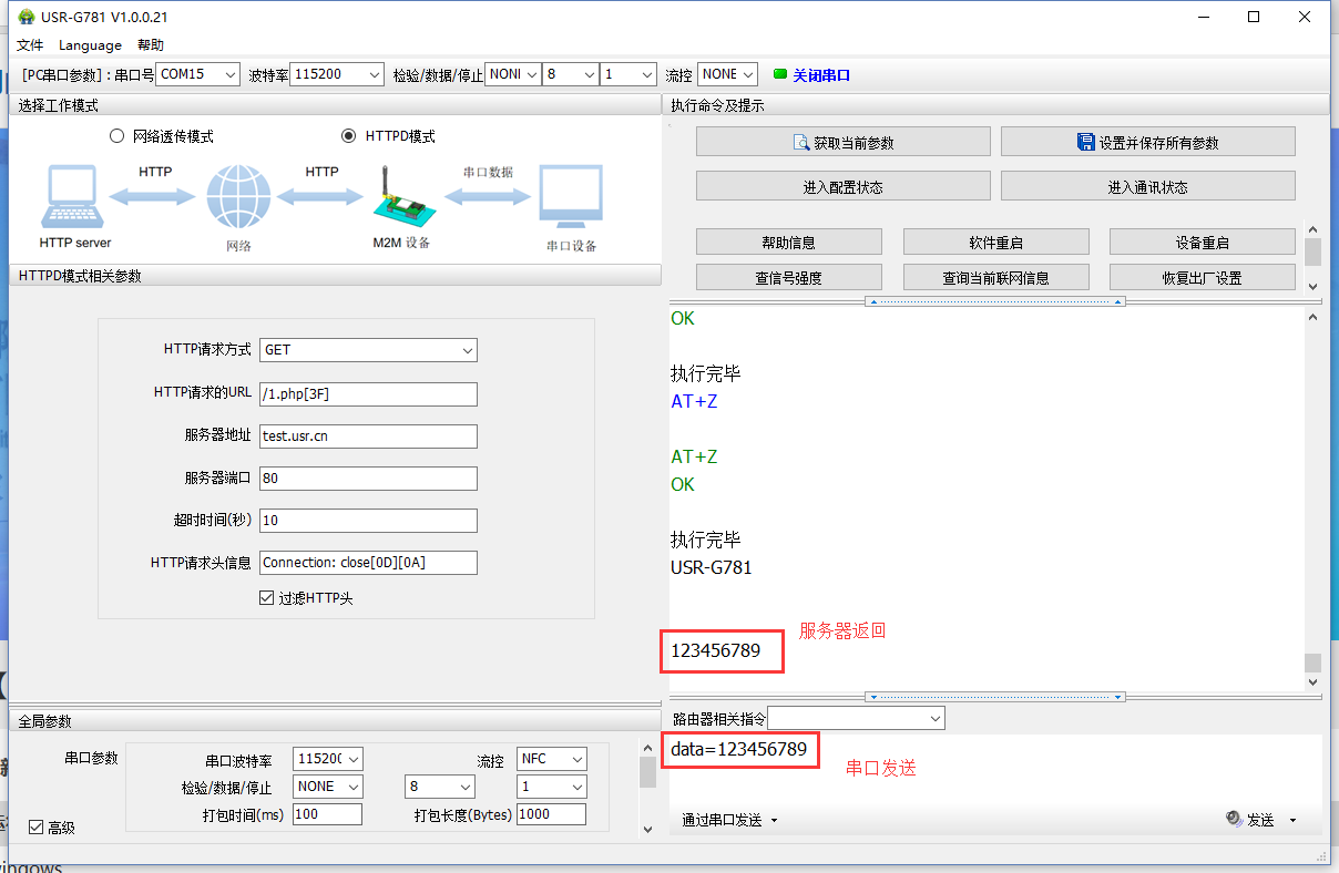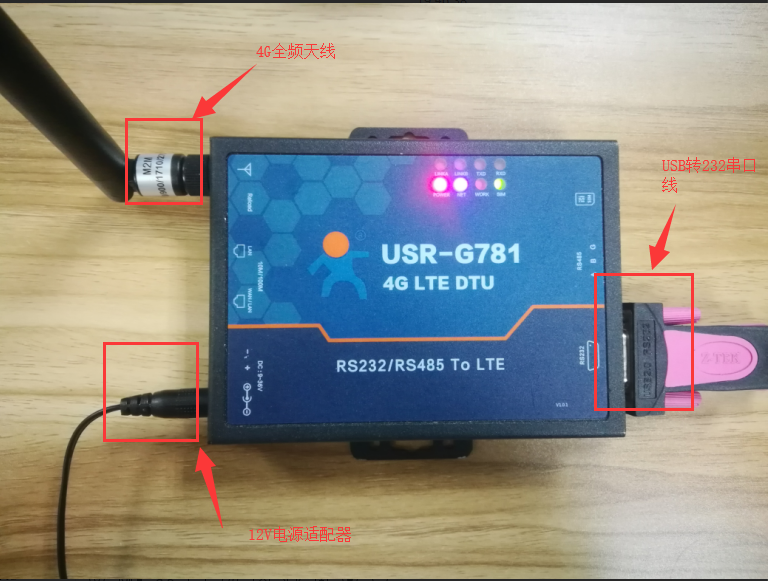 (1) 硬件连接:装上sim卡,接上天线,G781的串口通过USB转RS232/485接到PC上,用我司提供的12V电源适配器供电。