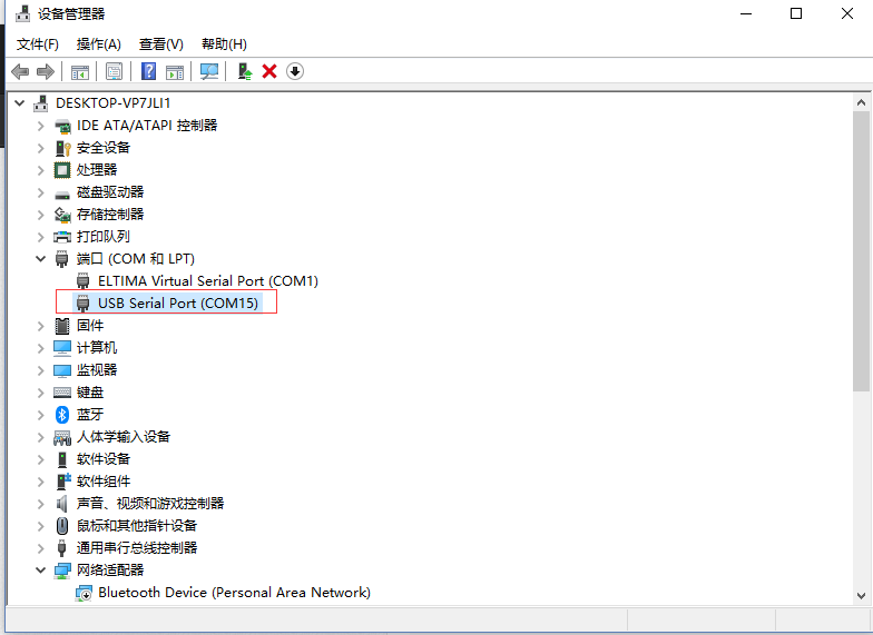 其中串口号可以在电脑的“设备管理器”中查看,见下图;