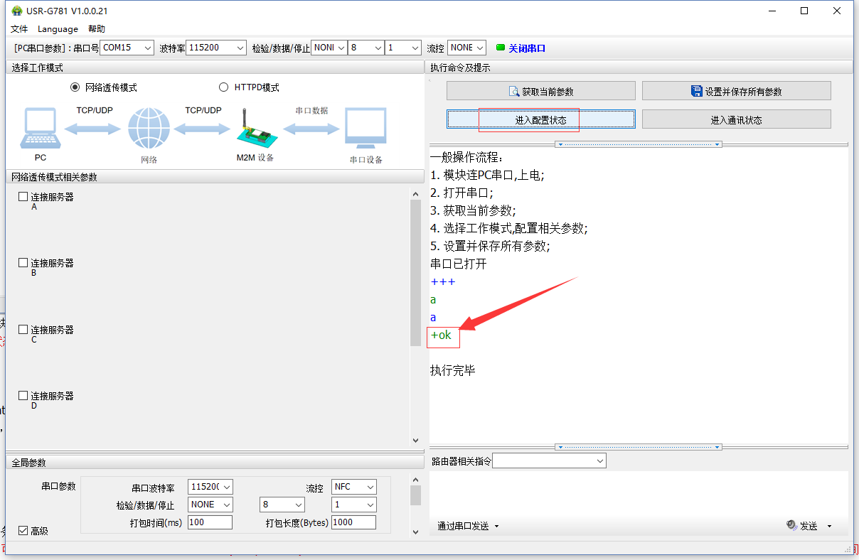 4. 点击进入配置状态,没有收到+OK,只有3个+++