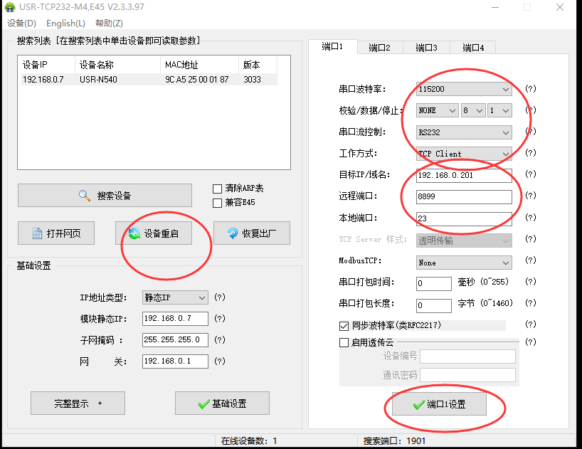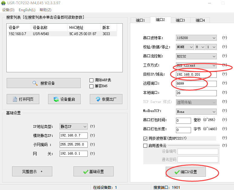 2. 打开设置软件:USR-TCP232-M4-setup-V2.3.3.97,点击搜索设备,然后将设备得工作模式选择“TCP client”,目标IP设置为“192.168.0.201”,然后端口号设置为“8899”,点击“端口一”设置,左下角回显出正确执行。