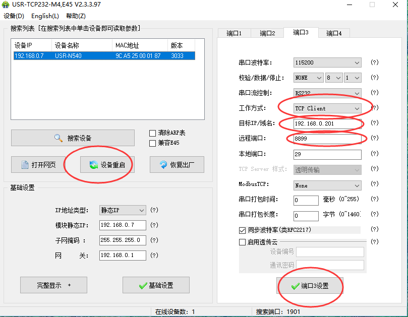 打开端口3将设备得工作模式选择“TCP client”,目标IP设置为“192.168.0.201”,然后端口号设置为“8899”,点击“端口三”设置,然后设备重启。