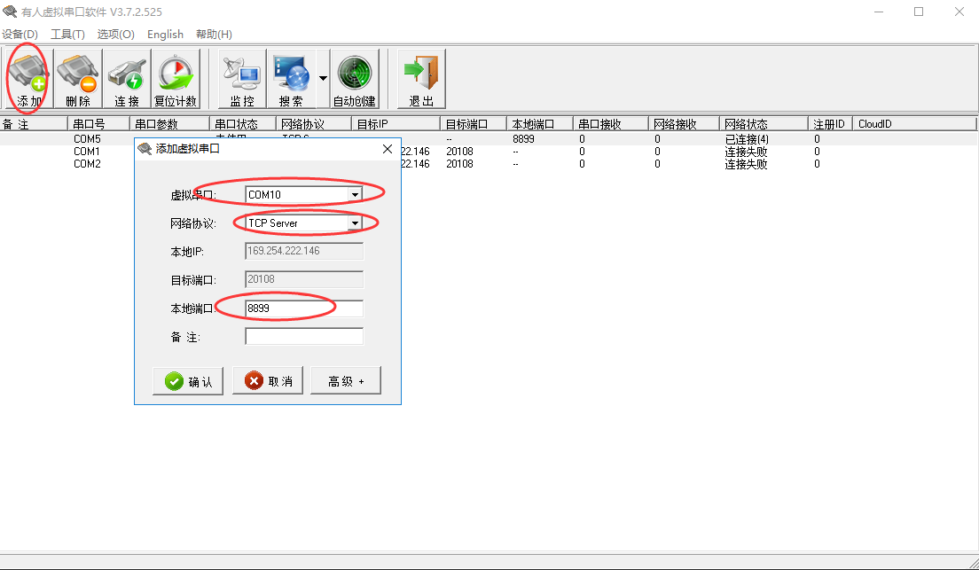 3.打开虚拟串口软件V-COM,左上角点击添加虚拟串口然后设置他得工作方式为“tcp sever”,然后本地端口是“8899”,点击确定。