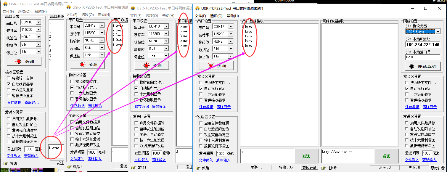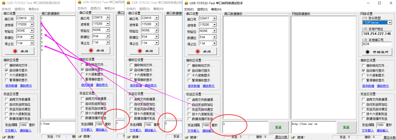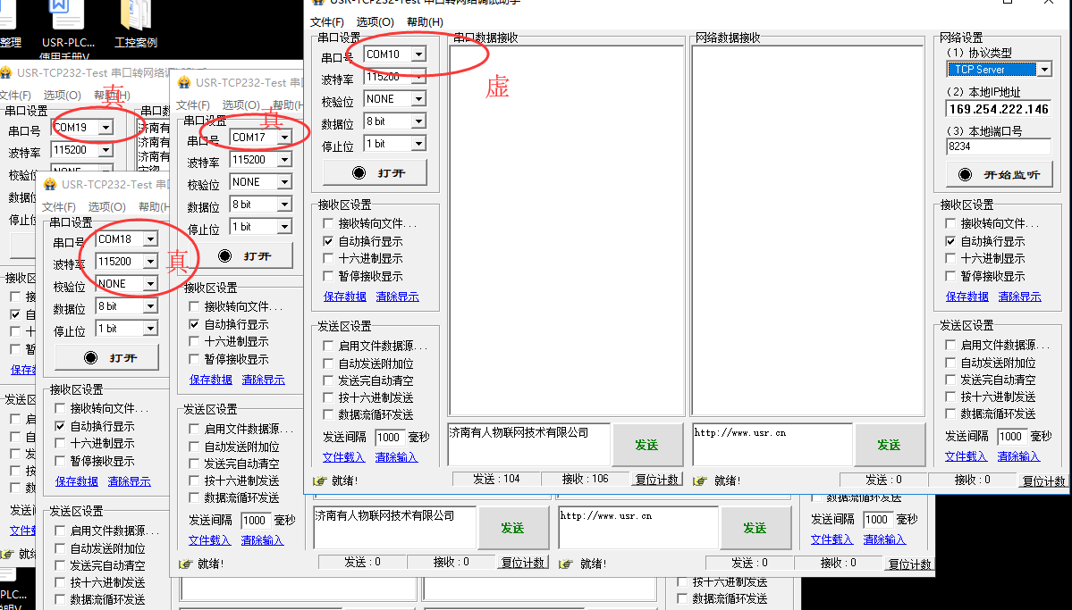 4. 打开4个小黄人测试软件:USR-TCP232-Test-V1.3,三个选择真实得串口(再设备管理器中可以查看),一个选择建立得虚拟串口(就是新建得com10).