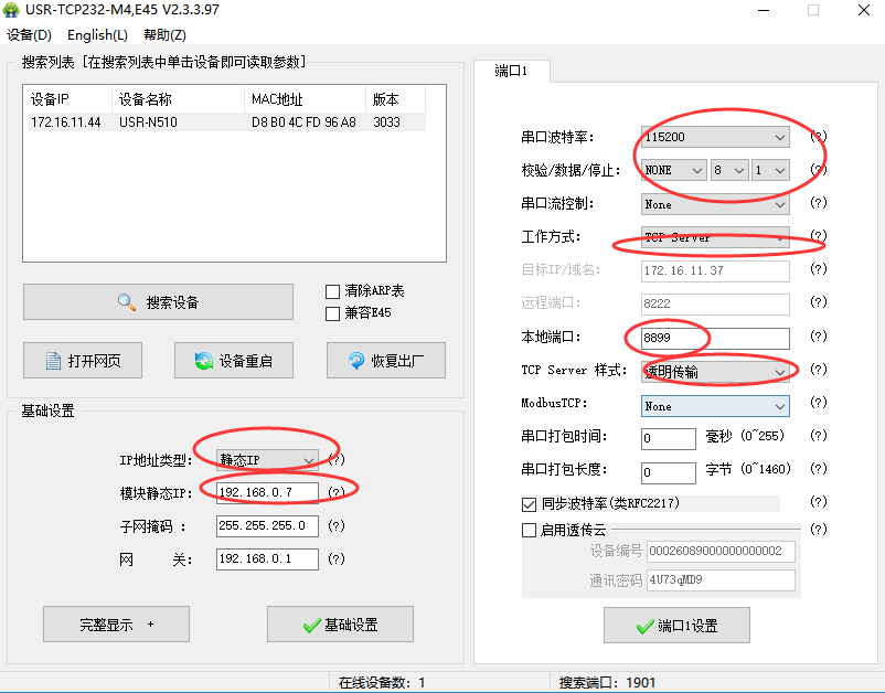 1. 设置N510(第一台)的参数:打开设置软件USR-TCP232-M4-setup-V2.3.3.97,设置他的工作方式为TCP sever,设置本地端口号为8899. 然后点击“端口1设置”,再点击“设备重启”。如图所示: