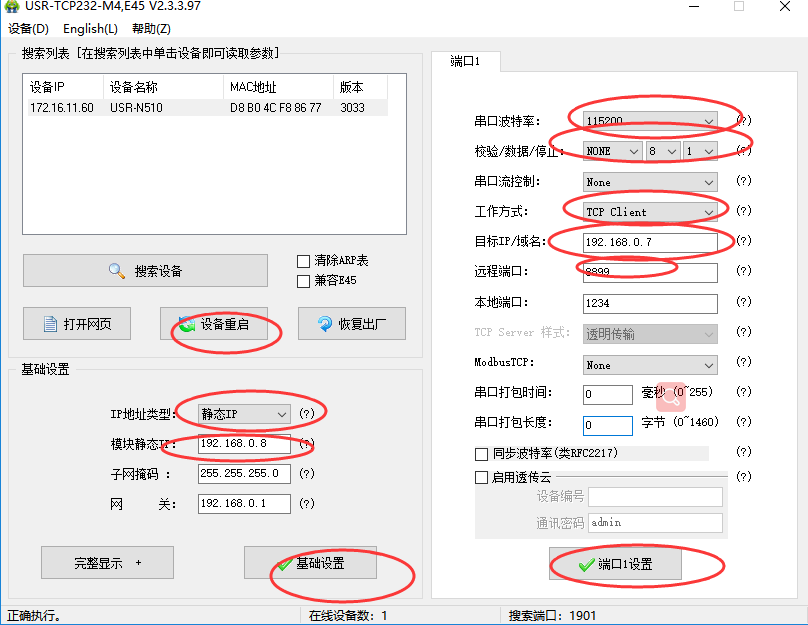 2. 设置N510 (第二台)的参数:打开设置软件USR-TCP232-M4-setup-V2.3.3.97,设置他的静态IP为“192.168.0.8”设置他的工作方式为TCP clinet,设置他的“目标IP/域名”为:192.168.0.7,设置远程端口号为8899,然后点击“端口1设置”,点击“基础设置”再点击“设备重启”。如图所示: