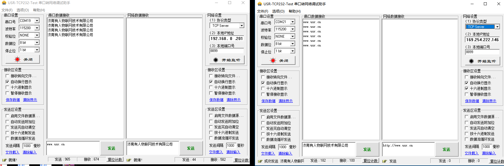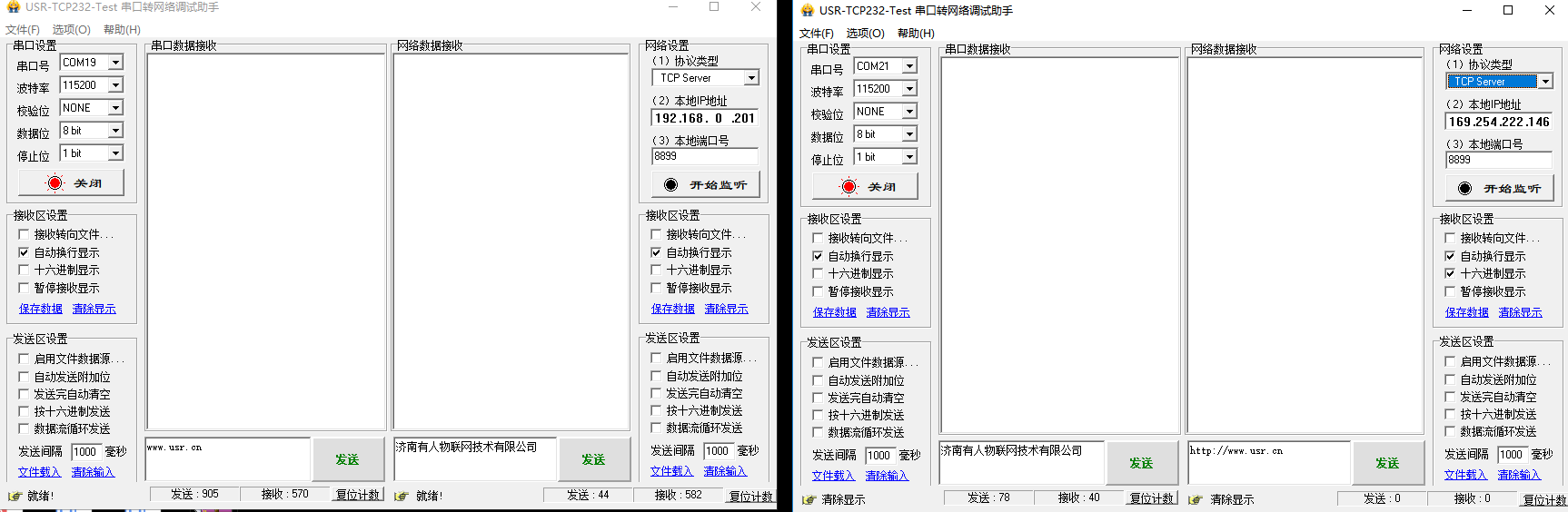 3. 将两太设备通过网线链接,分别用USB转232串口线将他们链接到电脑上,打开两个测试软件(USR-TCP232-Test-V1.3),分别打开两者对应的串口: