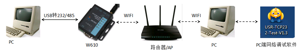 1. 硬件连接:W600接上wifi天线,串口通过USB转232/485接到PC,上电。W600正常启动后,电源指示灯常亮,work指示灯闪烁。