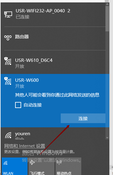 2. 电脑连接W600的wifi信号,会自动获取一个10.10.100.xx的IP地址