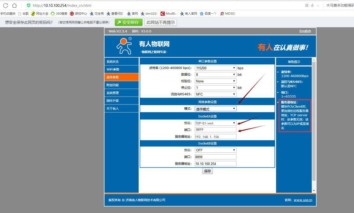 在这个选项中,可以设置W600的串口参数以及网络参数,客户可以根据实际情况确认是否需要修改波特率以及W600的网络工作模式,W600做TCP Client,连接副武器的ip和端口(此时,电脑做服务器,就需要设备连接电脑的ip和端口)