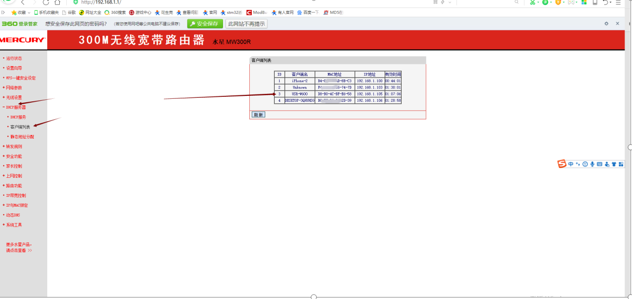 可以在路由器的管理界面查看W600的IP为192.168.1.105