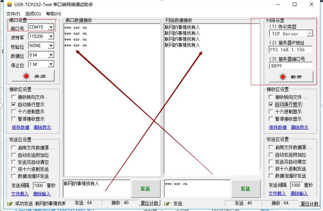 打开调试软件,网络端设置协议为TCP Server,IP地址是电脑本身的IP地址192.168.1.106,端口号是电脑的本地端口号8899,点击连接,连接成功;