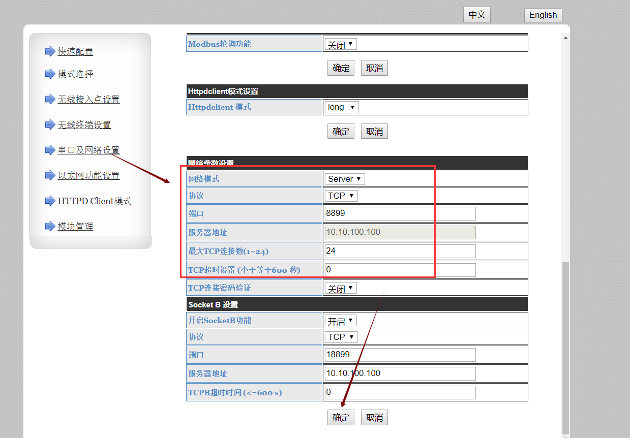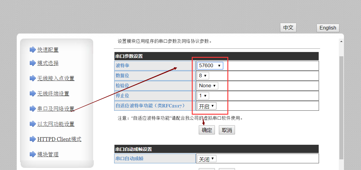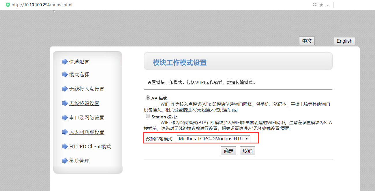 4、模式选择: STA,modbus rtu<=>modbus tcp协议转换。 注:确定后,不用立刻重启,等着全部修改完成一块重启。