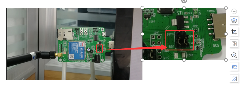 2. 安装驱动完成后,将405tf测试底板上的跳线帽接到USB端,见下图