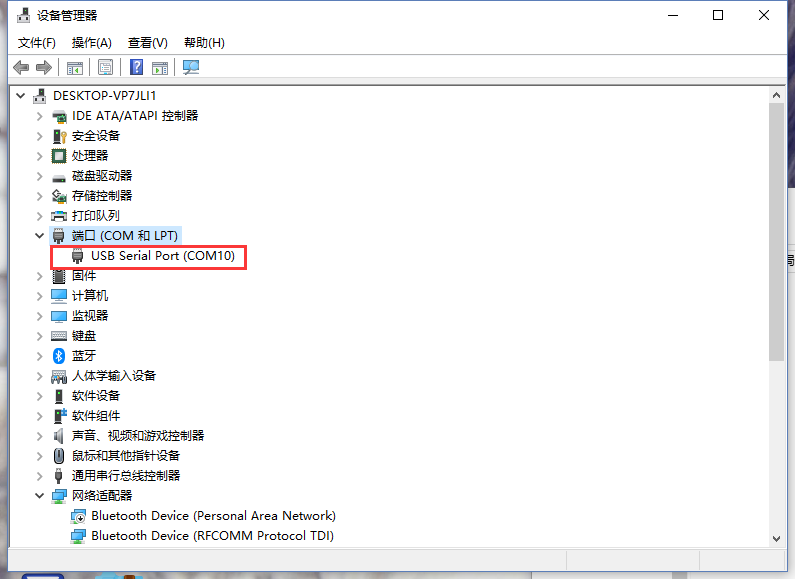 其中串口号可以在电脑的“设备管理器”中查看,见下图;