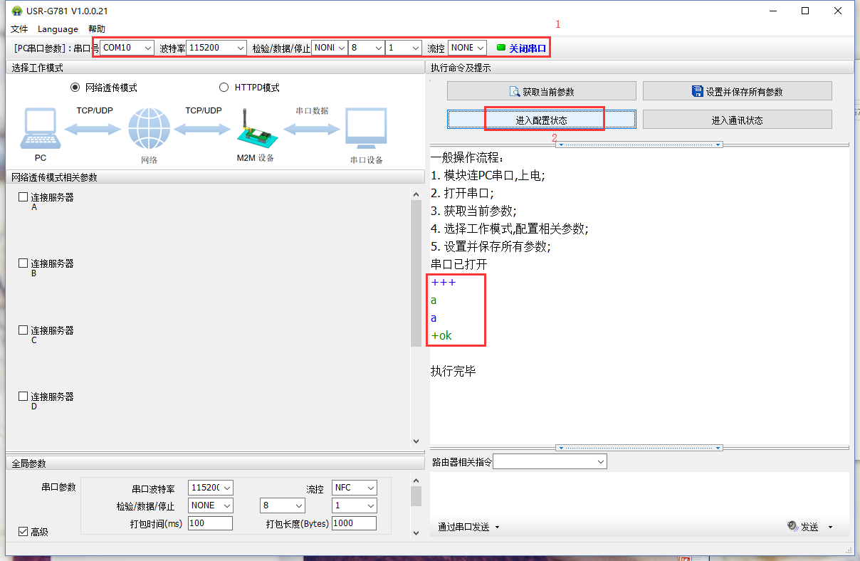 (2)数据通信。打开G781设置软件或者打开对应的串口调试助手,如下所示,可以实现双向数据通信,即表示OK