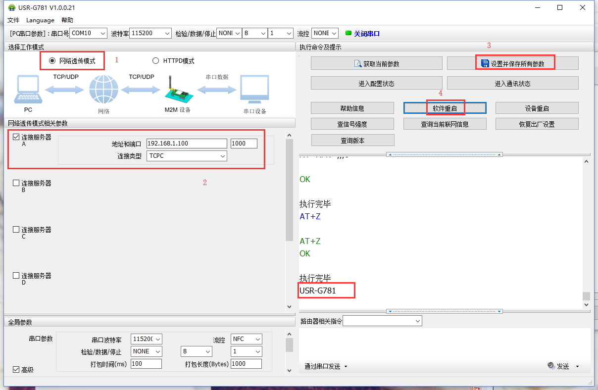 (3)设置参数。设置工作模式为“网络透传模式”,勾选链接服务器A,填写PC的IP和监听端口,链接类型选择TCPC,即TCP Client。设置完参数点击“设置并保存所有参数”,执行完毕后,点击软件重启,待串口打印启动信息,如“USR-G781”,代表设备重启完毕。