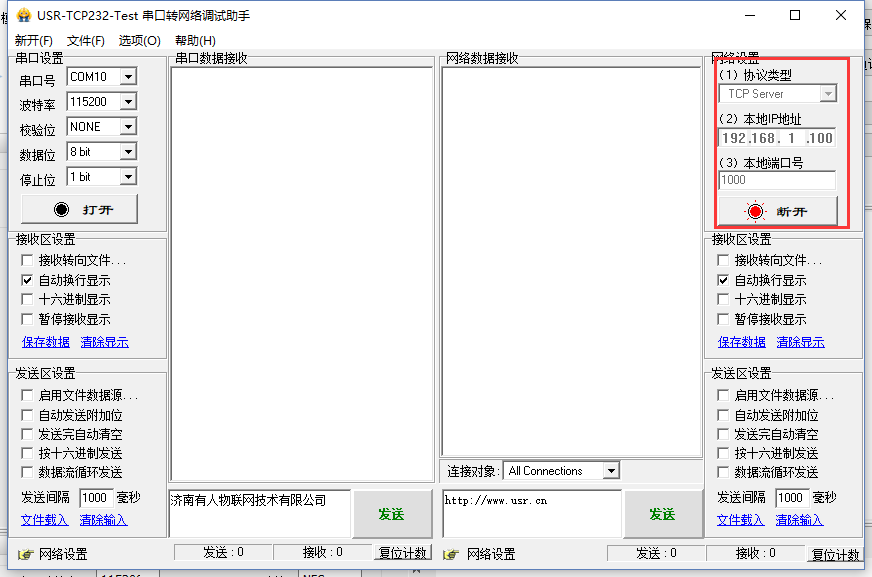 (1)打开网络调试助手,设置协议类型为TCP Server,本地IP地址为上述网卡中看到的IP地址,即192.168.1.100,端口号要与G781中设置的端口号一致。点击开始监听。