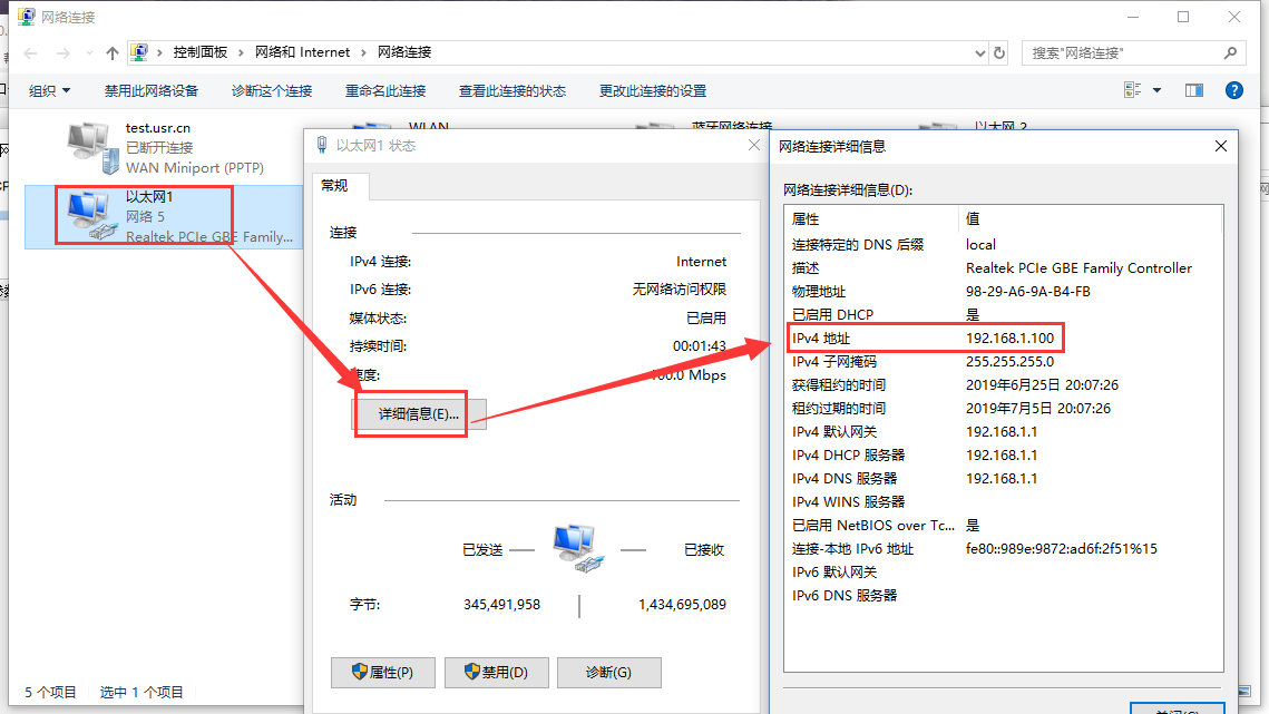 (3)打开网络共享中心,双击对应的网络适配器,点击属性,选择IPV4,点击属性,修改电脑为自动获取IP,然后点击确定。(如果电脑本来就是自动获取IP,这一步可以跳过)点击详细信息可以查看到电脑获取的IP地址: