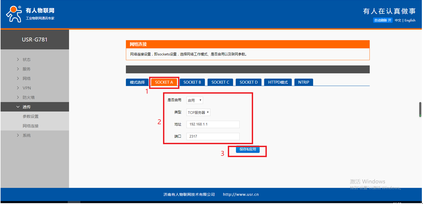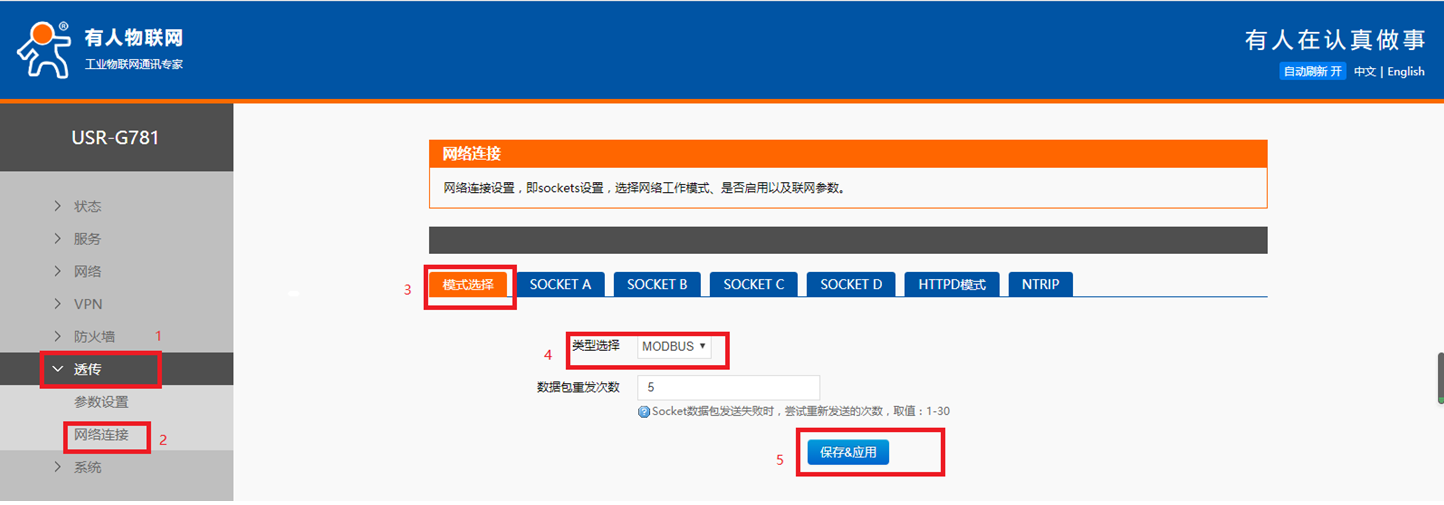 (5)点击左侧的透传——>网络参数,在页面中点击模式选择,在类型选择中选择MODBUS,然后点击保存。具体操作步骤如下图红色数字所示: