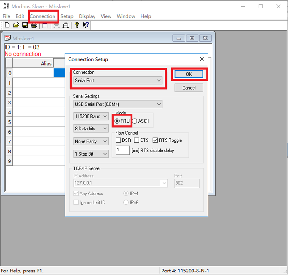 (7)打开modbus slave软件,点击Connection按键,在菜单中选择Connect,点击,出现如下选择框,按照下图进行选择。Connection一栏选择serial port,串口参数配置成和781的串口参数相同,mode选择RTU,然后点击ok。