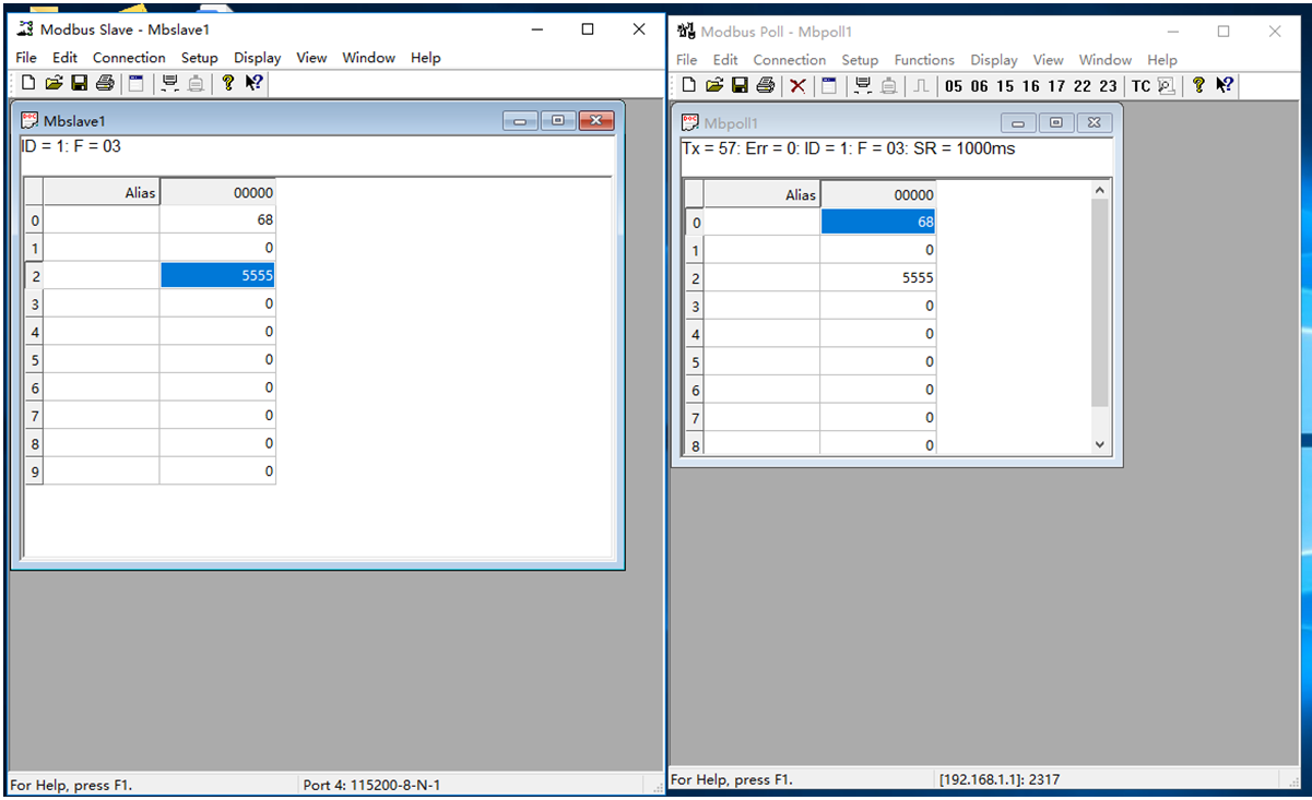 (10)观察两个软件的数据,修改slave中的数据,poll中的相应数据改变。修改poll中的数据,slave中的相应数据改变。通信成功