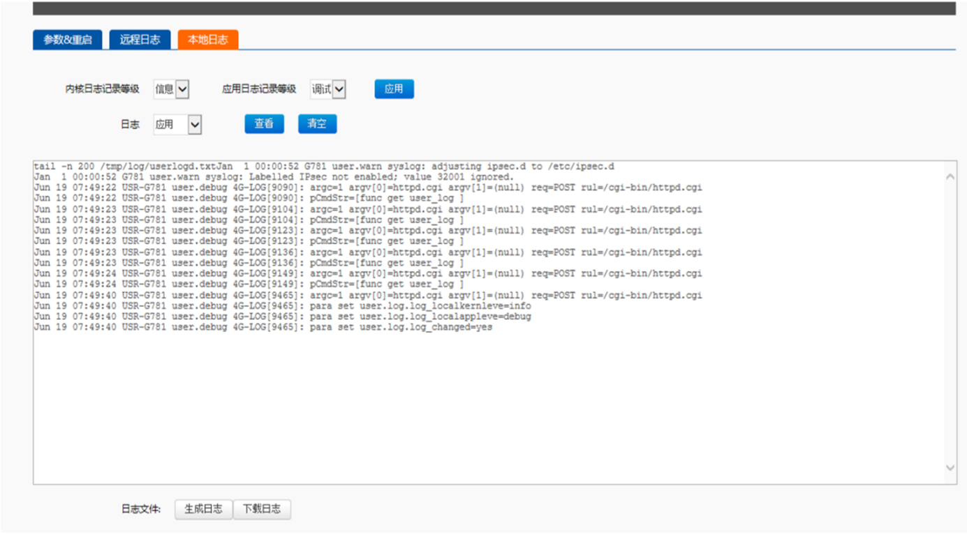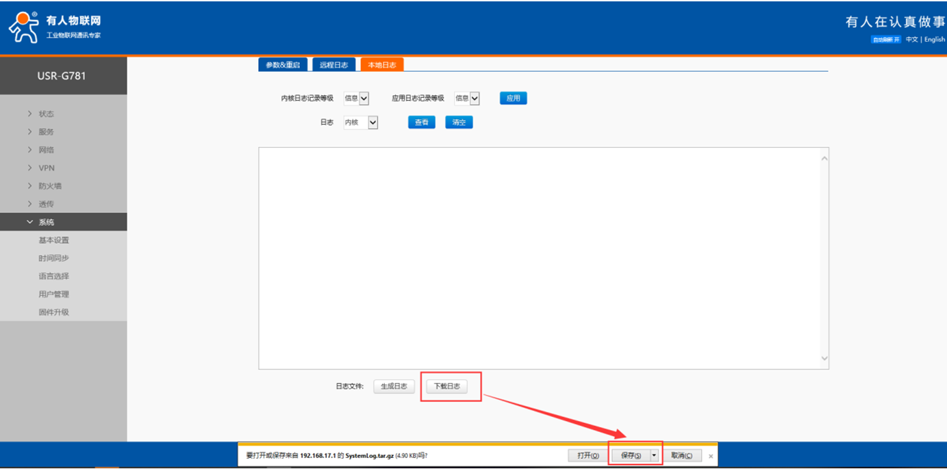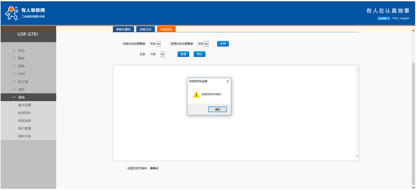 支持日志文件导出(先生成后导出),(不要修改日志等级),先点击生成日志,后点击下载日志。之后会生成一个压缩包,即日志文档。