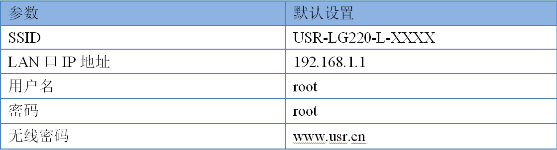 默认情况下,USR-LG220-L的无线AP的默认名称为USR-LG220-L -xxxx,IP地址和用户名、密码如下: