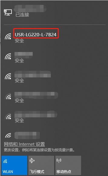 首先用PC的无线网卡,LG220的默认SSID为USR-LG220-xxxx,操作电脑的无线网卡加入这个无线网络。