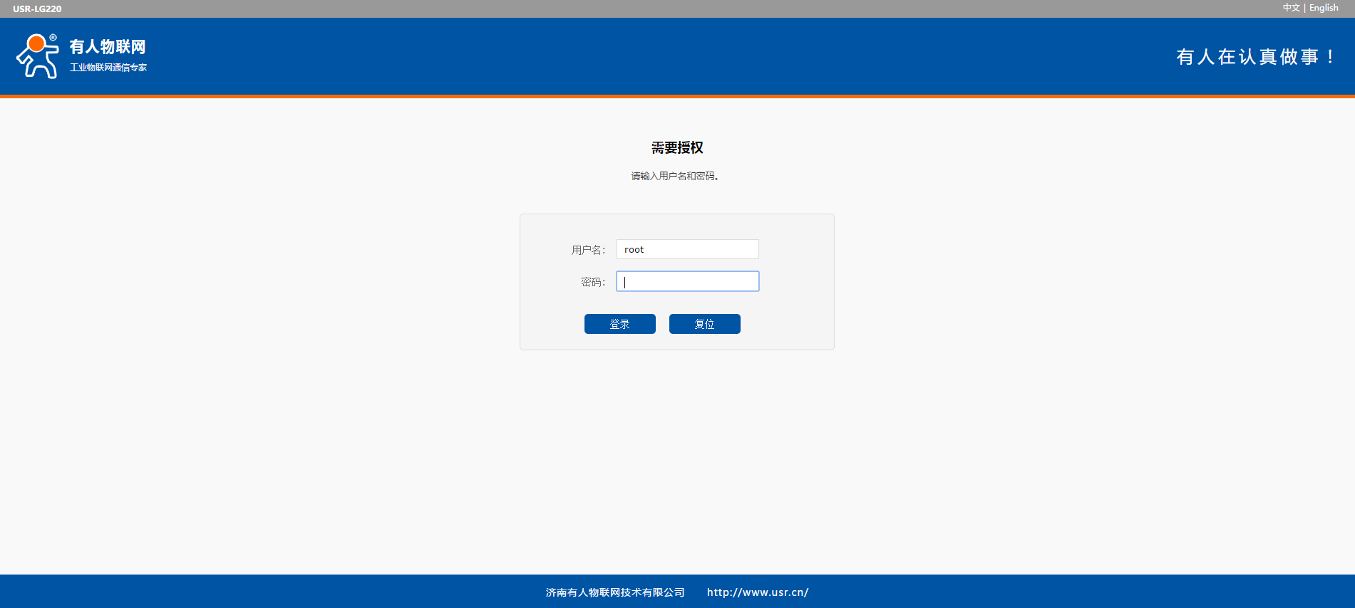 等无线连接好后,打开浏览器,在地址栏输入192.168.1.1回车。填入用户名和密码(均为root),然后点击确认登录,网页会出现USR-LG220-L的管理页面,如下图。